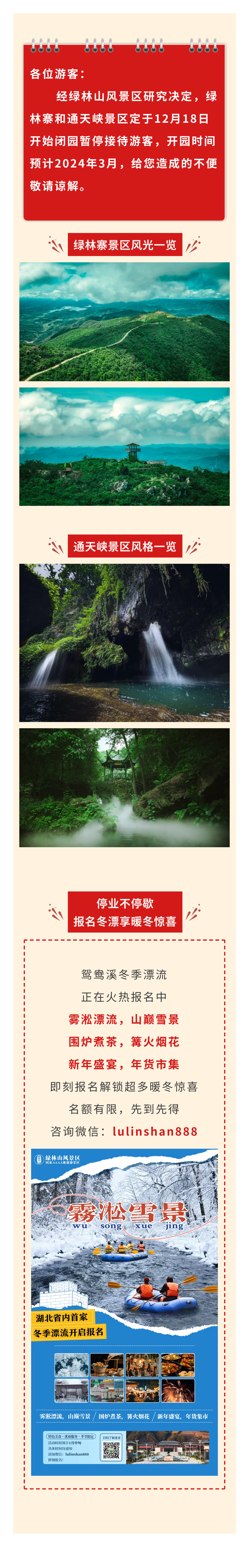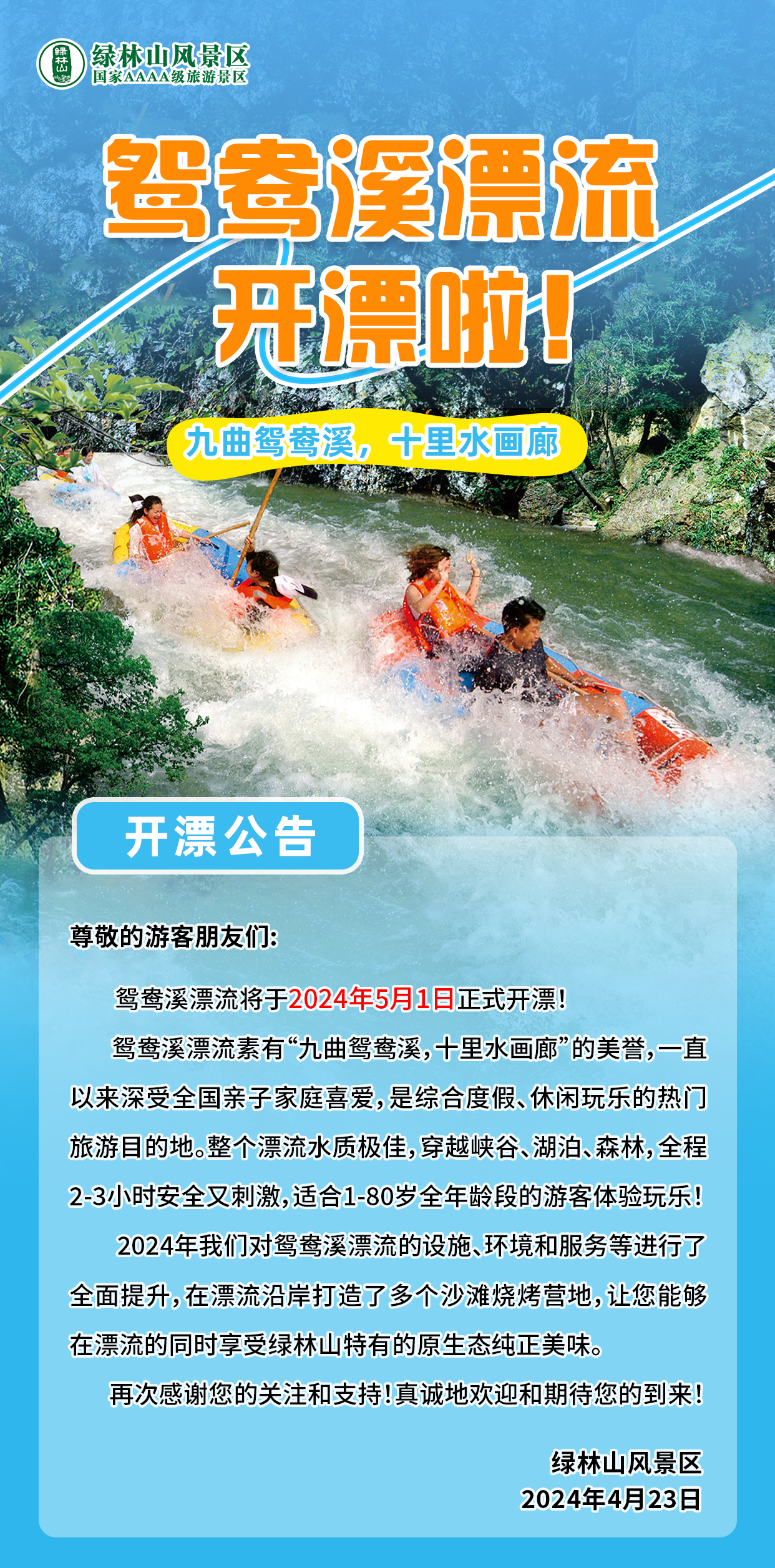尊敬的游客朋友:因景区降雨,气温较低。经绿林山风景区综合研究决定:鸳鸯溪漂流于5月3日-4日暂停接待,5月5日正常开漂,感谢大家的关注与支持!给您带来不便,敬请谅解!详情请致电景区客服电话:13387609593。 绿林山风景区 ...