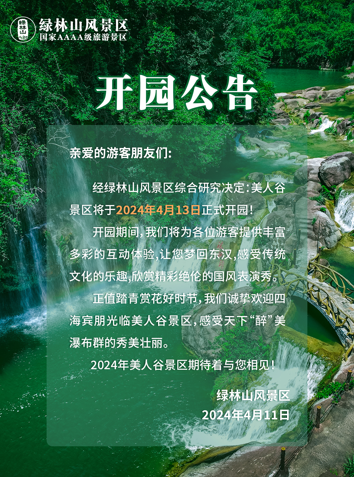 尊敬的游客朋友们:因景区下大雨,美人谷、空山洞、通天峡景区内步道涨水,绿林山风景区决定7月13日对美人谷、空山洞、通天峡以及绿林山露营地暂时关闭,预计7月14日起恢复开放。鸳鸯溪漂流与绿林寨景区7月13日正常营业,鸳鸯溪开漂时间为上午10:00,欢迎...